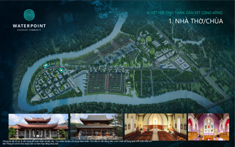 Thiết kế 2 khu đất dành cho xây dựng 1 nhà thờ và 1 ngôi chùa, để đảm bảo cuộc sống tinh thần, tín ngưỡng cho cư dân. Các không gian công cộng ngoài trời nên được tổ chức theo nguyên tắc tiếp cận dễ dàng, không gặp trở ngại và đa dạng hóa để mỗi người đều có thể tìm thấy vị trí/hoạt động của mình. Quy hoạch khu đô thị Waterpoint, Nam Long tách biệt hoàn toàn giao thông cơ giới với các lối đi bộ hay xe đạp dẫn đến các địa điểm sinh hoạt cộng đồng, vui chơi giải trí ngoài trời, vườn dạo… Bằng cách đó sẽ khuyến khích người dân tham gia vào các hoạt động cộng đồng ngoài trời hơn.