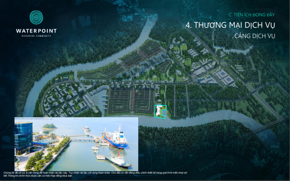 - Điểm đặc biệt của dự án – vai trò sông nước: các cảng chuyên dụng, cảng dịch vụ được thiết kế để tất cả giao thương chở nông sản, lương thực thực phẩm dùng tàu lớn có thể cập ở đây để chuyển lên đường bộ, hoặc lên để phục vụ cho cư dân trong dự án.